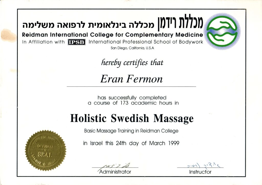 שמי ערן פרמון, אני בן 46. כבר 22 שנים שאני עוסק בעיסוי רפואי, במקצועי אני גם ספורטתרפיסט ומטפל במגוון רחב של בעיות. כגון: